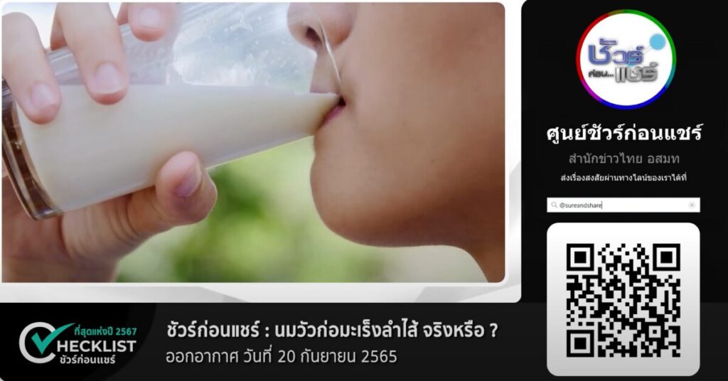 - ไม่จริง ยังไม่มีหลักฐานยืนยันว่านมวัวเป็นสาเหตุของมะเร็งลำไส้