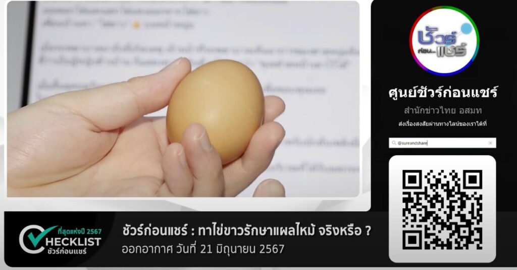 - ไม่จริง การทาไข่ขาวบนแผลไฟไหม้ อาจทำให้เกิดการติดเชื้อ
