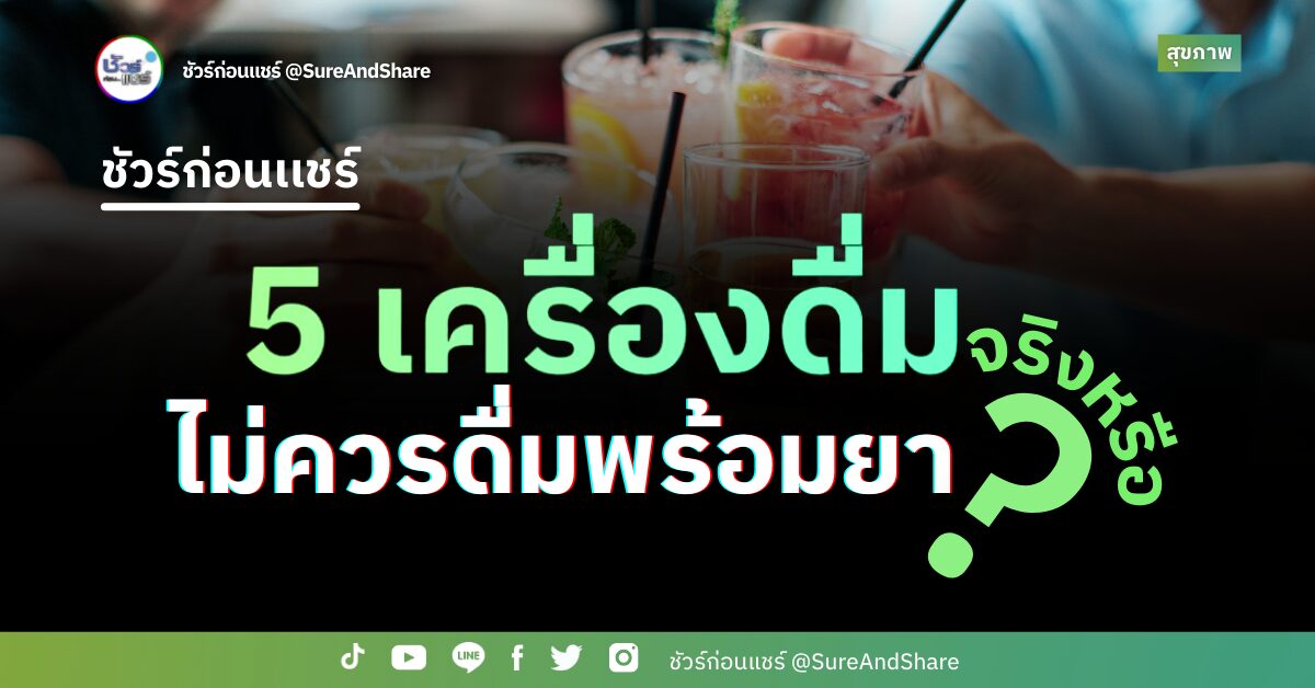 บนสื่อสังคมออนไลน์แชร์คำเตือนคนกินยา มี 5 เครื่องดื่มที่ไม่ควรดื่มพร้อมยา เช่น ชา กาแฟ นม น้ำผลไม้ น้ำอัดลม และ เครื่องดื่มที่มีแอลกอฮอล์ จริงหรือ ?