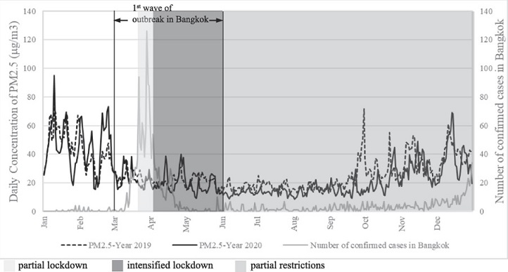 (Social Restriction Eff ects on Air Pollution : How the PM 2.5 Concentration Changed with Lockdown Management of COVID-19 Pandemic Control in Bangkok Thailand)