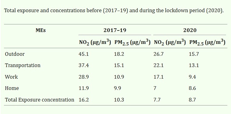 ส่วนการสัมผัส NO2 และ PM 2.5 ในช่วงเวลา 08.00 น. ลดลงอย่างมากในช่วงการล็อกดาวน์ โดยการสัมผัส NO2 ลดลง 66% ส่วนการสัมผัส PM 2.5 ลดลง 19%
