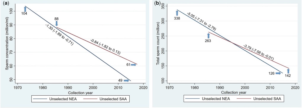 ผลสำรวจพบว่าค่าเฉลี่ยจำนวนอสุจิทั้งหมด (Total Sperm Count) ของผู้ชายในทวีปอเมริกาเหนือ ยุโรป และออสเตรเลียเมื่อปี 1973 อยู่ที่ 335.7 ตัว ส่วนค่าเฉลี่ยจำนวนอสุจิทั้งหมดของผู้ชายในทวีปอเมริกาเหนือ ยุโรป และออสเตรเลียเมื่อปี 2018 อยู่ที่ 126.6 ตัว เท่ากับว่าจำนวนอสุจิทั้งหมดของผู้ชายลดลงปีละ 1.4% หรือลดลง 62.3% ในรอบ 45 ปี ซึ่งการลดลงของจำนวนอสุจิยังพบว่าเพิ่มขึ้นเป็น 2 เท่านับตั้งแต่ปี 2000 เป็นต้นมา