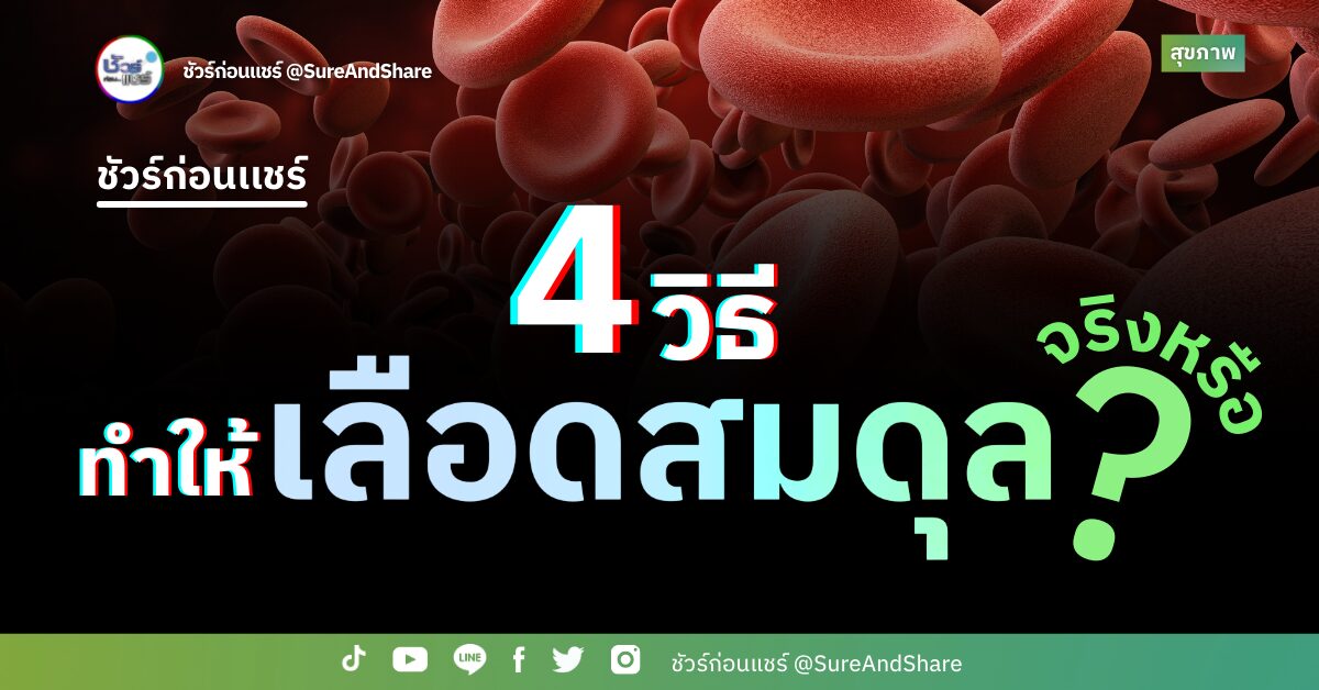 บนสื่อสังคมออนไลน์แชร์แนะนำ 4 วิธี ทำให้เลือดสมดุลมากขึ้น ค่า pH อยู่ในเกณฑ์ปกติ เลือดไหลเวียนดี ช่วยให้ร่างกายแข็งแรง มีตั้งแต่ลดความเครียด พักผ่อนให้เพียงพอ หลีกเลี่ยงสารเสพติด หรืออาหารหวาน-มัน และดื่มน้ำให้มาก จริงหรือ ?