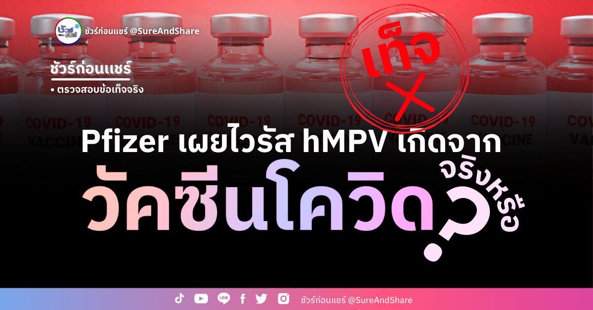 มีข้อมูลเท็จเกี่ยวกับวัคซีนโควิด-19 เผยแพร่ทางสื่อสังคมออนไลน์ในต่างประเทศ โดยอ้างว่า Pfizer บริษัทผู้ผลิตยายอมเปิดเผยข้อมูลอาการข้างเคียงจากวัคซีนโควิด-19 เป็นครั้งแรก โดยหนึ่งในอาการข้างเคียงที่ระบุในเอกสารของ Pfizer ก็คือการติดเชื้อไวรัส hMPV ที่ส่งผลต่อระบบทางเดินหายใจ ซึ่งพบการระบาดอย่างมากในสาธารณรัฐประชาชนจีนในช่วงฤดูหนาวที่ผ่านมา