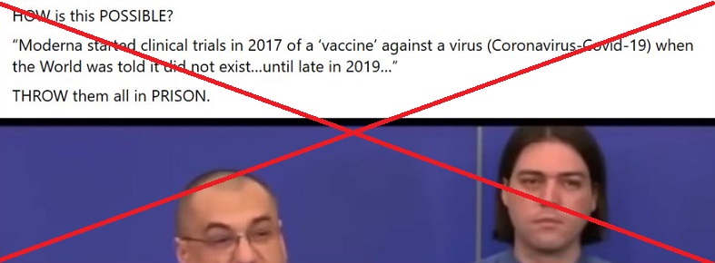 มีข้อมูลเท็จเกี่ยวกับวัคซีนโควิด-19 เผยแพร่ทางสื่อสังคมออนไลน์ในต่างประเทศ โดยอ้างว่า Moderna รู้ล่วงหน้าว่าจะมีการแพร่ระบาดของไวรัสโควิด-19 เป็นเวลาหลายปี เนื่องจากพบหลักฐานการทดลองวัคซีนโควิด-19 ตั้งแต่ปี 2017