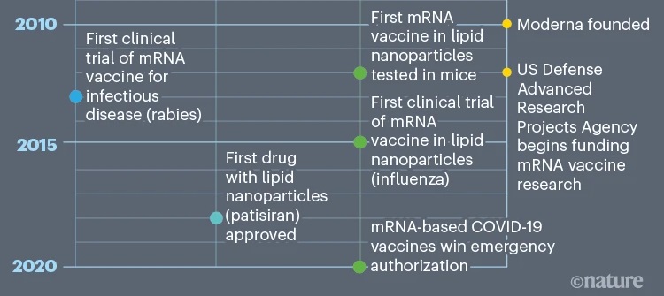 แผนภูมิจากวารสาร Nature แสดงเส้นทางการพัฒนาวัคซีน mRNA ที่นำไปสู่การผลิตวัคซีนโควิด-19 ในอีกหลายปีต่อมา