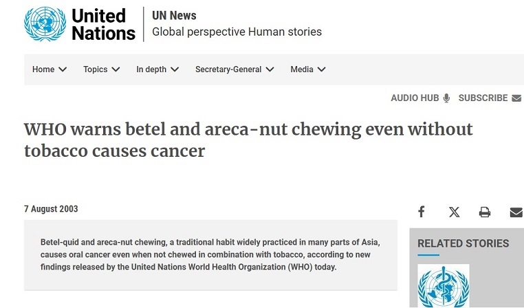 WHO ประกาศให้การเคี้ยวหมากและใบพลู เพิ่มความเสี่ยงการเกิดมะเร็งในช่องปาก แม้จะเคี้ยวโดยไม่ร่วมกับการใช้ยาสูบก็ตาม