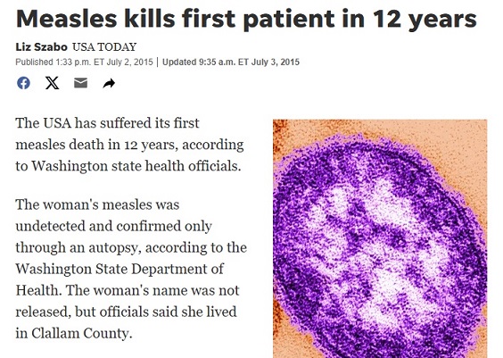 ผู้เสียชีวิตรายดังกล่าว เป็นสตรีที่อาศัยอยู่ในรัฐวอชิงตัน ซึ่งรายงานของสำนักข่าว Seattle Times เมื่อปี 2016 ระบุว่าเธอผู้นี้ น่าจะเคยฉีดวัคซีนป้องกันโรคหัดสมัยที่ยังเป็นเด็ก แต่ผู้ปกครองของเธอไม่มีหลักฐานยืนยันการฉีดวัคซีนของลูกสาวแต่อย่างใด