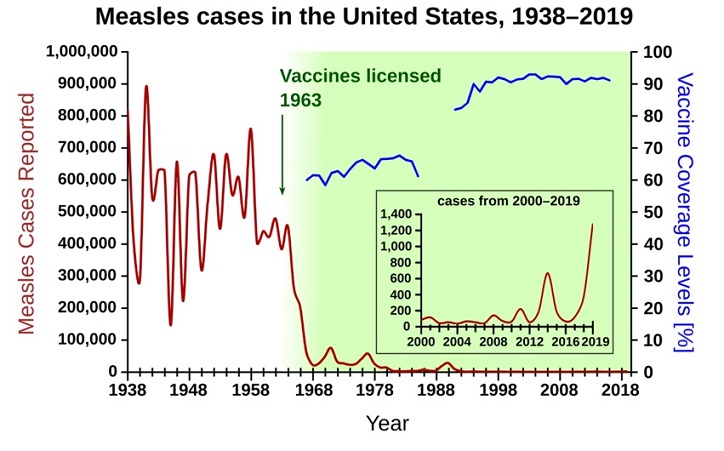 กระทั่งการใช้วัคซีนป้องกันโรคหัดเป็นครั้งแรกในปี 1963 สหรัฐฯ มีผู้ติดเชื้อโรคหัดลดลงเหลือปีละหลักหมื่นราย