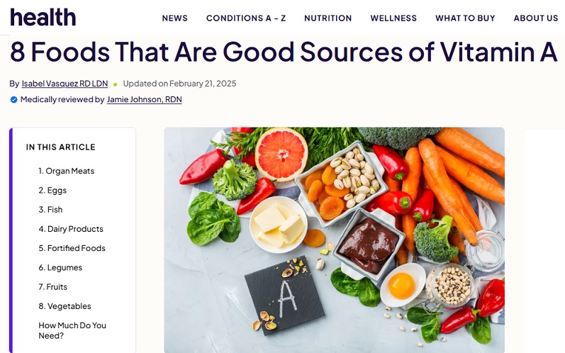 วิตามินเอ เป็นสารที่จำเป็นต่อร่างกาย พบได้ทั้งในสัตว์ เช่น เนื้อสัตว์ ปลา ไข่ นม และพืชผัก เช่น ผักสีเขียว และผลไม้สีส้ม เหลือง และแดง