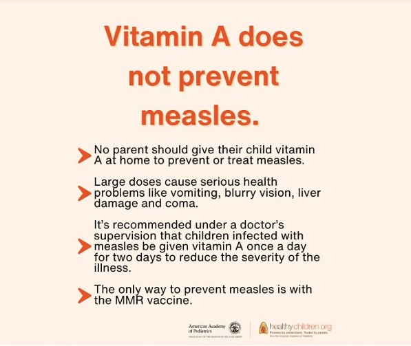 การที่วิตามินเอแนะนำให้ใช้รักษาผู้ป่วยโรคหัด แต่ไม่มีหลักฐานว่าวิตามินเอช่วยป้องกันการติดเชื้อโรคหัด การที่ โรเบิร์ต เอฟ. เคนเนดี จูเนียร์ ออกมาให้ความสำคัญกับวิตามินเอพอ ๆ กับวัคซีน ในช่วงการแพร่ระบาดของโรคหัด อาจสร้างความเข้าใจผิดว่าวิตามินเอสามารถใช้ทดแทนวัคซีนในการรับมือกับโรคหัดได้