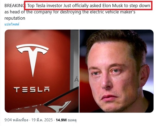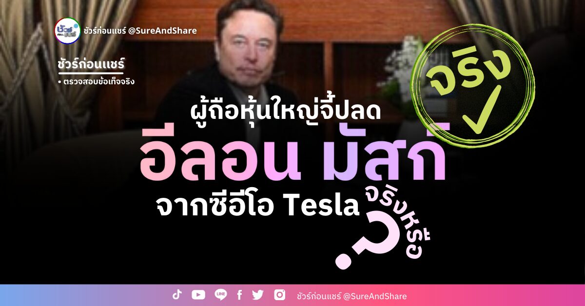 มีข้อมูลน่าสงสัยเกี่ยวกับรถยนต์ BEV ยี่ห้อ Tesla เผยแพร่ทางสื่อสังคมออนไลน์ในต่างประเทศ โดยอ้างว่า ผู้ถือหุ้นระดับสูงสุดของ Tesla เรียกร้องให้มีการปลด อีลอน มัสก์ จากตำแหน่งประธานเจ้าหน้าที่บริหารของบริษัทรถยนต์ Tesla