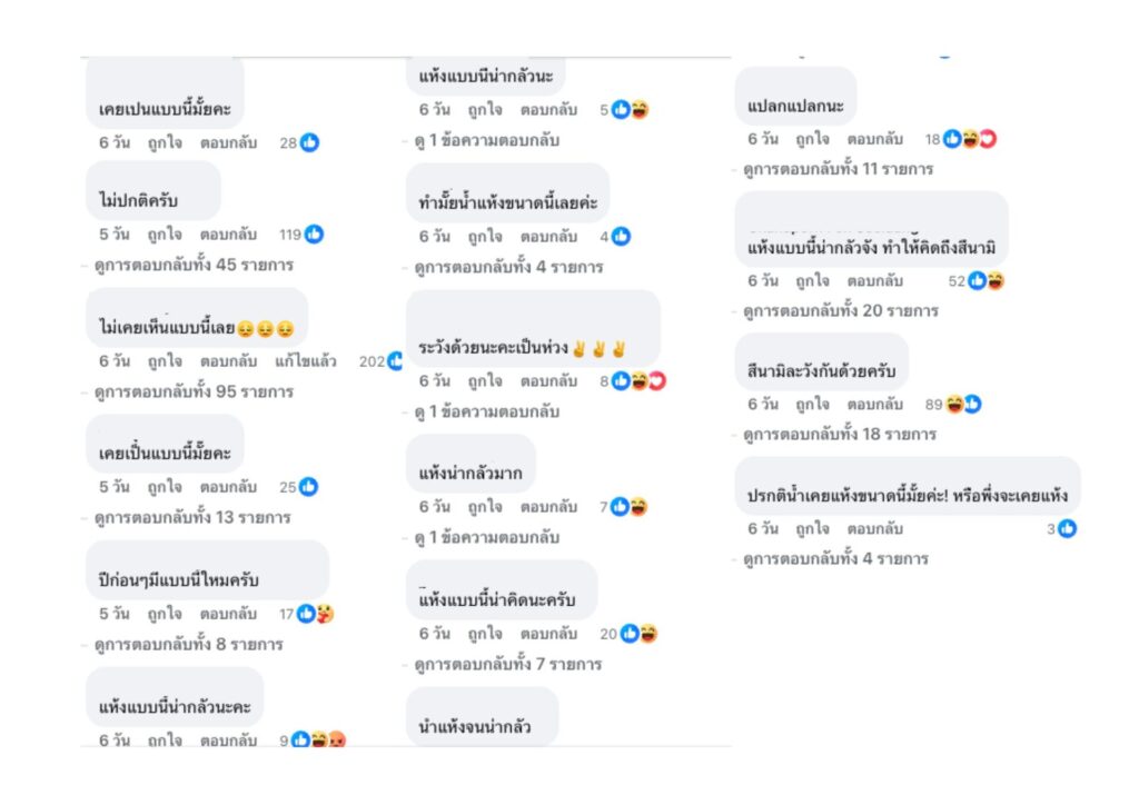 อย่างไรก็ตาม ผู้ใช้เฟซบุ๊กบางส่วนเกิดกังวลว่าสถานการณ์ดังกล่าวอาจเป็นสัญญาณเตือนการเกิดภัยพิบัติทางธรรมชาติ เช่น “น้ำแห้งจนน่ากลัว” “แห้งแบบนี้น่ากลัวจัง ทำให้คิดถึงสึนามิ” จึงเป็นเหตุให้มีผู้อ่านเกิดความกังวลและได้สอบถามเข้ามาที่ศูนย์ชัวร์ก่อนแชร์