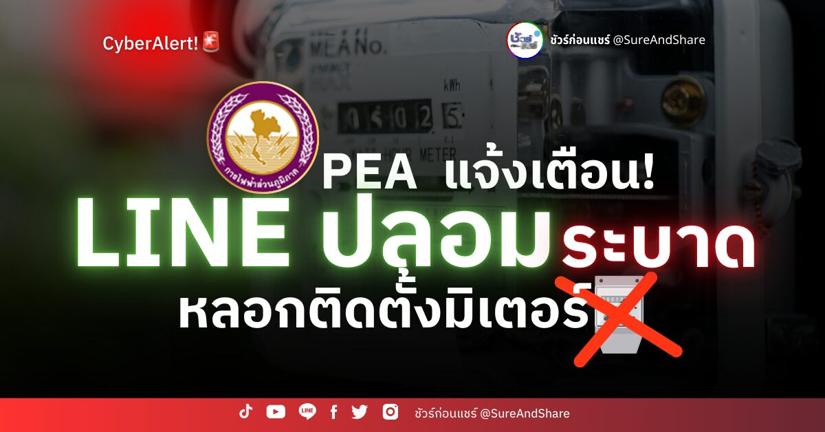 การไฟฟ้าส่วนภูมิภาค (กฟภ.) ยืนยัน บัญชี LINE ชื่อ “ฝ่ายมิเตอร์ไฟฟ้า” เป็นบัญชีปลอม โดยการไฟฟ้าส่วนภูมิภาค เปิดให้บริการติดต่อผ่านไลน์ ไอดี @PEAThailand และของแท้ต้องมีโล่สีเขียวเท่านั้น