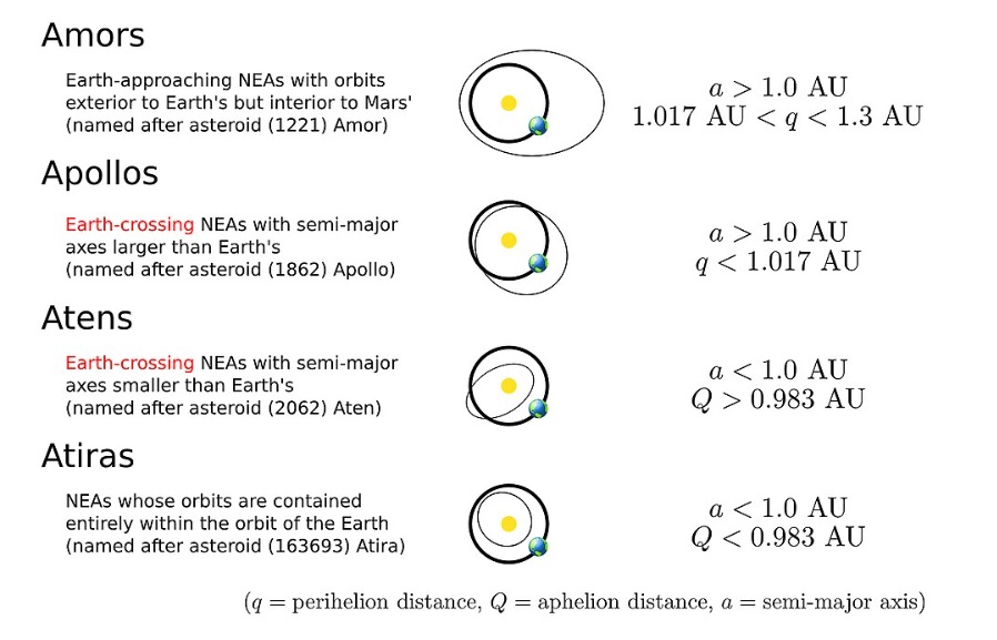 ดาวเคราะห์น้อยชนิด NEAs แบ่งได้ 4 กลุ่มตามรูปแบบของวงโคจร ได้แก่