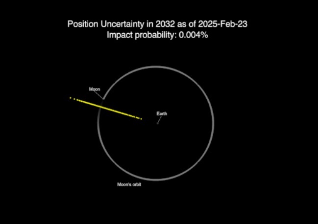 แม้ต่อมาจะมีการปรับลดความเป็นไปได้เหลือเกือบ 0% แต่กลับพบว่า โอกาสที่ 2024 YR4 จะพุ่งชนดวงจันทร์ในเดือนธันวาคม 2032 กลับเพิ่มขึ้นถึงเกือบ 4%