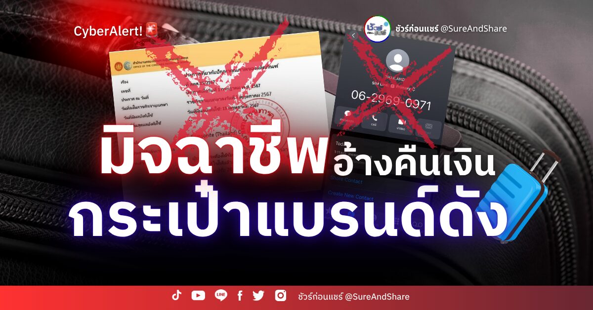 ชัวร์ก่อนแชร์ CyberAlert!🚨 เตือนภัยนักเดินทางและนักช้อป ขณะนี้กำลังมีกลโกงรูปแบบใหม่ระบาดหนัก มิจฉาชีพแอบอ้างเป็นเจ้าหน้าที่จากแบรนด์กระเป๋าเดินทาง SAMSONITE โดยมีพฤติกรรมโทรศัพท์ติดต่อเหยื่อและหลอกว่า กระเป๋าที่คุณซื้อไปไม่ผ่านมาตรฐาน สคบ. พร้อมเสนอที่จะคืนเงิน โดย SAMSONITE ประเทศไทย ได้ประกาศยืนยัน ไม่มีนโยบายโทรศัพท์ติดต่อลูกค้าเพื่อขอข้อมูลส่วนตัว ให้โอนเงิน กดลิงก์ หรือให้แอดไลน์อื่นนอกจากช่องทางทางการของบริษัทฯ
