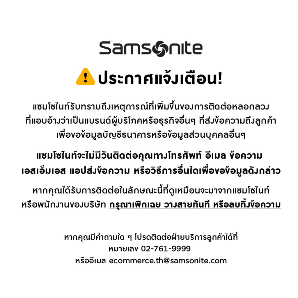 หากพบความผิดปกติของเบอร์โทร หรือ SMS ข้อความ ที่ติดต่อเข้ามา สามารถแจ้งผ่าน 02-761-9999 และ Email ecommerce.th@samsonite.com โดย SAMSONITE จะตรวจสอบร่วมกับหน่วยงานที่เกี่ยวข้องเพื่อดำเนินการทางกฎหมายต่อไป