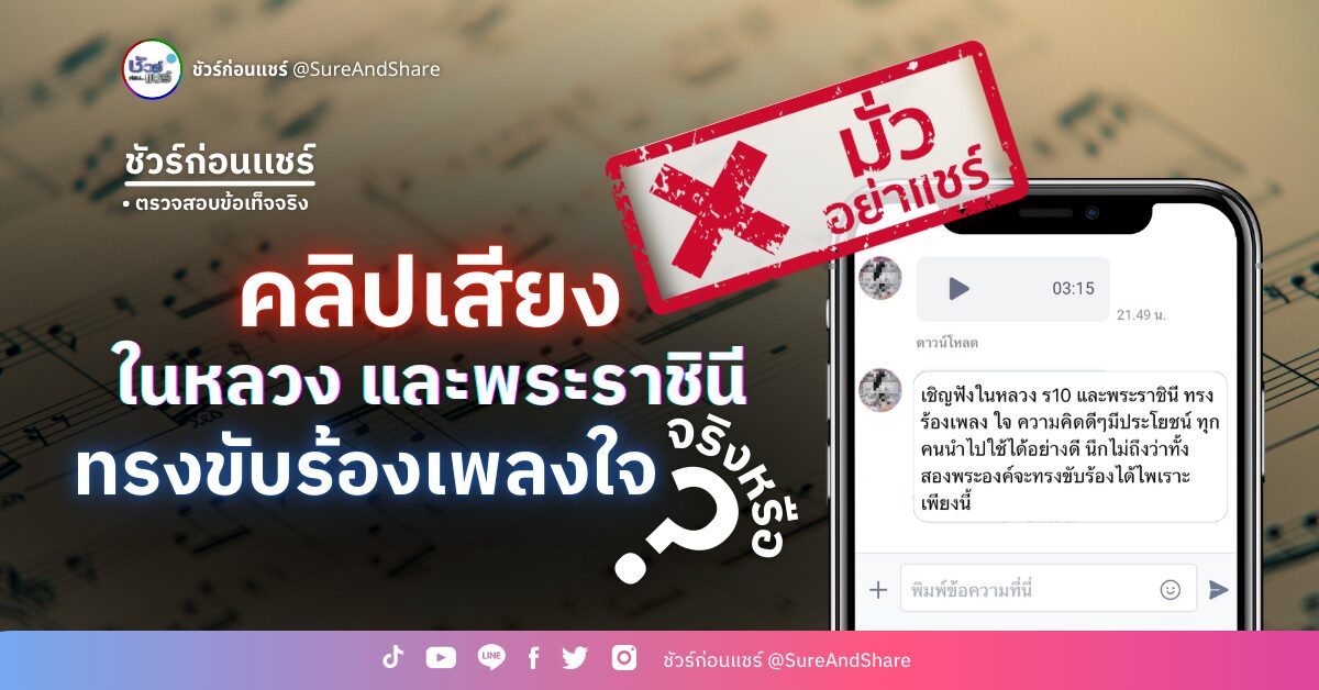 ศูนย์ชัวร์ก่อนแชร์ ตรวจสอบว่า คลิปเสียงและข้อความที่แชร์กัน เป็นเรื่องเก่า ตั้งแต่ปี 2563 และคลิปเสียงที่แชร์กันนั้น เป็นเพลงที่มีชื่อว่า คนดีไม่มีวันตาย ขับร้องโดย คุณธีร์ ไชยเดช และ คุณรัตนา จงสุทธานามณี ไม่ใช่ พระสุรเสียงของในหลวงรัชกาลที่ 10 และพระราชินี แต่อย่างใด