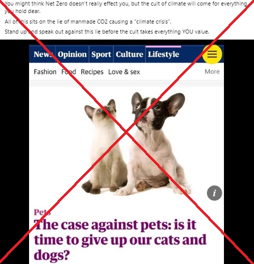 ข้ออ้างว่าสื่อแนะนำให้คนเลิกเลี้ยงสัตว์เพื่อยับยั้งภาวะโลกร้อน มาจากบทความเรื่อง The case against pets: is it time to give up our cats and dogs? เผยแพร่ทางเว็บไซต์หนังสือพิมพ์ The Guardian เมื่อปี 2023 ซึ่งอ้างว่าสื่อดังของประเทศอังกฤษได้รับเงินสนับสนุนจาก บิล เกตส์ มหาเศรษฐีที่รณรงค์เรื่องโลกร้อน The Guardian จึงกระตุ้นให้ผู้อ่านเลิกเลี้ยงสัตว์ เพื่อเอาใจแนวคิดรักษ์โลกตามอย่างนายทุนที่ออกเงินสนับสนุนสำนักข่าว