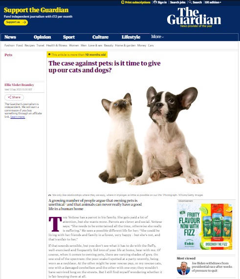 อย่างไรก็ดี แม้คำที่ใช้ในการพาดหัวข่าว อาจทำให้เข้าใจผิดว่าบทความพูดถึงทางเลือกในการยุติการมีสัตว์เลี้ยง แต่จริง ๆ แล้ว หัวใจของเนื้อหาพูดถึงหลักจริยธรรมในการเลี้ยงสัตว์เอาไว้ในบ้าน และวิธีสร้างสภาพแวดล้อมให้สัตว์เลี้ยงมีความสุข
