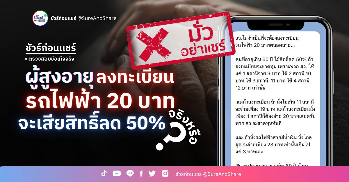 ตามที่มีการแชร์ข้อความระบุ ผู้สูงอายุ ลงทะเบียนรถไฟฟ้า 20 บาทตลอดสาย จะเสียสิทธิ์ 50 % นั้น