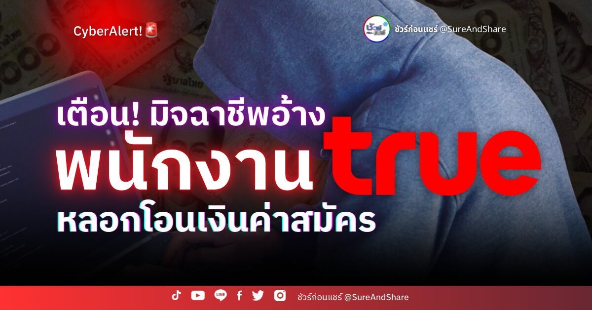 บริษัท ทรู คอร์ปอเรชั่น จำกัด (มหาชน) ขอแจ้งเตือนลูกค้า อย่าหลงเชื่อมิจฉาชีพที่แอบอ้างเป็นพนักงานทรู เสนอโปรโมชั่นติดตั้งอินเทอร์เน็ตราคาถูก พร้อมเรียกเก็บค่าสมัครหรือค่าบริการใด ๆ โดยไม่มีใบแจ้งค่าบริการจากทรูและให้โอนเงินเข้าบัญชีบุคคล
