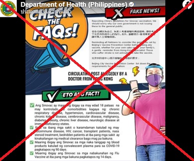 มีข้อมูลเท็จเผยแพร่ผ่านทาง Facebook ในประเทศฟิลิปปินส์ โดยอ้างว่าศูนย์ป้องกันการติดเชื้อด้วยวัคซีน (Vaccine Prevention Center) ในกรุงปักกิ่ง ระบุรายชื่ออาการต้องห้ามสำหรับการฉีดวัคซีนโควิด 19 ของบริษัท Sinovac ซึ่งรวมถึงผู้ที่มีโรคประจำตัวและการใช้ยาบางชนิดด้วย จนมีผู้นำข้อความไปแชร์ต่อกันกว่า 23,000 ครั้ง
