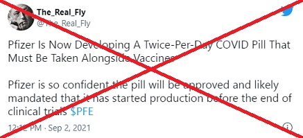 มีข้อมูลบิดเบือนเผยแพร่ทาง Twitter ในสหรัฐอเมริกา โดยอ้างว่าบริษัท Pfizer เตรียมจำหน่ายยาต้านไวรัสโควิด 19 ที่ต้องกินวันละ 2 เม็ดร่วมกับฉีดวัคซีนไปด้วย และคาดว่าจะจำหน่ายก่อนการทดลองเสร็จสมบูรณ์อีกด้วย