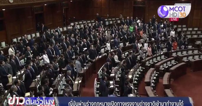 สภาผู้แทนราษฎรญี่ปุ่นผ่านร่างกฎหมายเปิดทางให้แรงงานต่างชาติหลายแสนคนเข้ามาอาศัยและทำงานในญี่ปุ่นได้ เนื่องจากขาดแคลนแรงงานและจำนวนผู้สูงวัยมีมากขึ้น