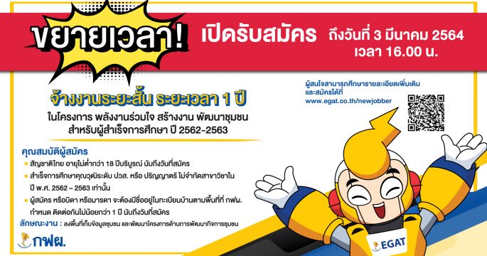 กฟผ.ขยายเวลารับสมัครนักศึกษาจบใหม่เข้าร่วม “โครงการพลังงานร่วมใจ สร้างงาน พัฒนาชุมชน” ครั้งที่ 2 เพิ่มเติมอีก 7 วัน โดยจะเปิดรับสมัครต่อเนื่องตั้งแต่วันนี้-3 มี.ค.64