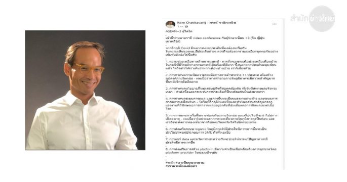 กรุงเทพฯ 14 เม.ย.- วันนี้ (14 เม.ย.) นายกรณ์ จาติกวณิช ว่าที่หัวหน้าพรรคกล้า และอดีตรัฐมนตรีว่าการกระทรวงการคลัง โพสต์เฟซบุ๊ก ถึงประเด็นการประชุมอาเซียน + 3 ที่นายกรัฐมนตรีของไทยร่วมประชุมหารือเรื่องโควิด-19 ว่า ประเด็นต่างๆ ที่ผู้นำอาเซียนควรพูดคุยกัน คือ เรื่องความช่วยเหลือทางด้านการแพทย์ การตั้งกองทุนเพื่อช่วยเหลือเพื่อนบ้านในกรณีที่มีวิกฤติทางการแพทย์ การเพิ่มความร่วมมือทางการค้าระหว่าง 13 ประเทศ เพื่อสร้างอุปสงค์ภายในกลุ่ม เพราะเชื่อว่าการค้าขายภายในภูมิภาคจะมีความสำคัญมากขึ้น หลังวิกฤติคลี่คลายควรกำหนดนโยบายฟื้นฟูเศรษฐกิจที่สอดคล้องกัน ทั้งในทิศทางและจังหวะเวลา กำลังซื้อ และกระบวนการการผลิต นายกรณ์ ยังเสนอว่า ควรกำหนดระบบการดูแล และการขึ้นทะเบียนแรงงานต่างด้าว และระบบการกำกับการเคลื่อนไหว เพราะโควิด-19 ที่วิกฤติในเอเชียและทั่วโลกส่วนสำคัญมาจากแรงงาน ที่มีลักษณะการทำงานและอยู่อาศัยที่สุ่มเสี่ยงต่อการติดและแพร่เชื้อโรค ควรการวางแผนการรื้อฟื้นการท่องเที่ยวภายในกลุ่ม และเงื่อนไขที่จะนำไปสู่การเปิดตลาด เพราะเชื่อว่าในช่วงแรกการท่องเที่ยวภายในภูมิภาคจะฟื้นก่อน และจะพึ่งการท่องเที่ยวจากโซนตะวันตกไม่ได้ไปอีกระยะหนึ่ง นอกจากนี้ ควรส่งเสริมระบบโลจิสติกส์ในภูมิภาคให้มีประสิทธิภาพมากขึ้น จะเป็นประโยชน์ต่อผู้ประกอบการเอสเอ็มอีทั่วทั้งเอเชีย การแชร์ดาต้าและนวัตกรรมระหว่างกัน เพื่อให้สามารถเข้าถึงโดยไม่มีการผูกขาด .- สำนักข่าวไทย