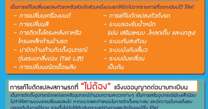 กรมการขนส่งทางบก ระบุการแก้ไขดัดแปลงตัวรถหรือส่วนหนึ่งส่วนใดผิดไปจากรายการที่จดทะเบียนไว้ เช่น เปลี่ยนเครื่องยนต์ เปลี่ยนสี หรือการเสริมแหนบ เพื่อใช้บรรทุกสิ่งของให้ได้ปริมาณที่มากขึ้น ต้องได้รับอนุญาตจากกรมการขนส่งทางบก ฝ่าฝืนมีความผิดตามกฎหมาย