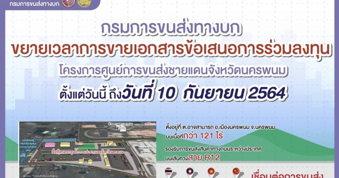 กรมการขนส่งทางบก ขยายระยะเวลาการขายเอกสารข้อเสนอการร่วมลงทุนโครงการศูนย์การขนส่งชายแดนจังหวัดนครพนม ตั้งแต่บัดนี้เป็นต้นไป จนถึงวันที่ 10 กันยายน 2564