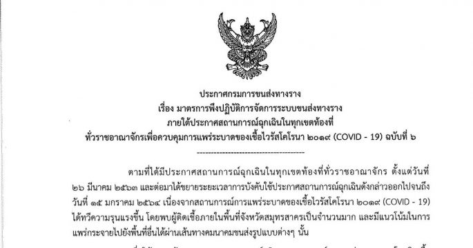 กรมการขนส่งทางราง (ขร.) ออกประกาศ ห้ามรถไฟจอดรับส่งผู้โดยสาร ภายในเขตจังหวัดสมุทรสาคร งดเดินรถไฟในช่วงเวลาเคอร์ฟิว ควบคุมการแพร่ระบาดของไวรัสโควิด – 19
