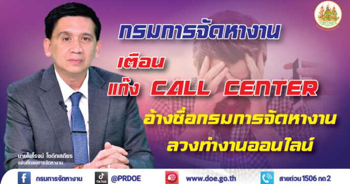 อธิบดี กกจ. ห่วงคนหางาน แจ้งเตือนแก๊งคอลเซ็นเตอร์ระบาดหนัก แอบอ้างชื่อกรมการจัดหางาน ลวงทำงานออนไลน์ หวั่นประชาชนตกเป็นเหยื่อให้ข้อมูลส่วนบุคคล สูญเงินหมดบัญชี