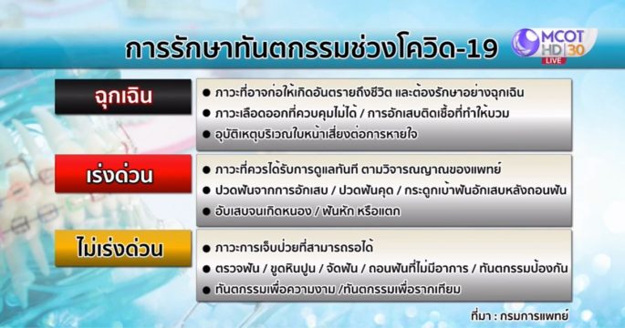 หลังกรมการแพทย์ออกประกาศแนวทางการรักษาทางทันตกรรมช่วงการแพร่ระบาดของโควิด-19 รักษาเฉพาะกรณีฉุกเฉินเท่านั้น ส่งผลให้ร้านทำฟันหลายแห่งหยุดให้บริการ ทันตแพทย์จิตอาสาจึงให้คำปรึกษาเรื่องช่องปากผ่านไลน์ พร้อมคัดกรองคนไข้ฉุกเฉิน