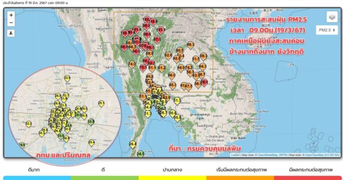 กรุงเทพฯ 19 มี.ค. – กรมควบคุมมลพิษเผย ค่าฝุ่นละอองขนาดเล็ก PM2.5 ยังเกินค่ามาตรฐาน 45 จังหวัด แต่มีแนวโน้มลดลงตั้งแต่วันพรุ่งนี้ ศูนย์สื่อสารการแก้ไขปัญหามลพิษทางอากาศ กรมควบคุมมลพิษ (คพ.) ติดตามตรวจสอบคุณภาพอากาศประจำวันที่ 19 มีนาคม 2567 ณ 07:00 น. โดยพบว่า ปริมาณ PM2.5 ในประเทศพบเกินค่ามาตรฐานใน 45 จังหวัดได้แก่ จังหวัดเชียงราย เชียงใหม่ น่าน แม่ฮ่องสอน พะเยา ลำพูน ลำปาง แพร่ อุตรดิตถ์ สุโขทัย พิษณุโลก ตาก กำแพงเพชร พิจิตร เพชรบูรณ์ นครสวรรค์ อุทัยธานี ชัยนาท สิงห์บุรี ลพบุรี สระบุรี อ่างทอง สุพรรณบุรี กาญจนบุรี ราชบุรี ปราจีนบุรี บึงกาฬ หนองคาย […]