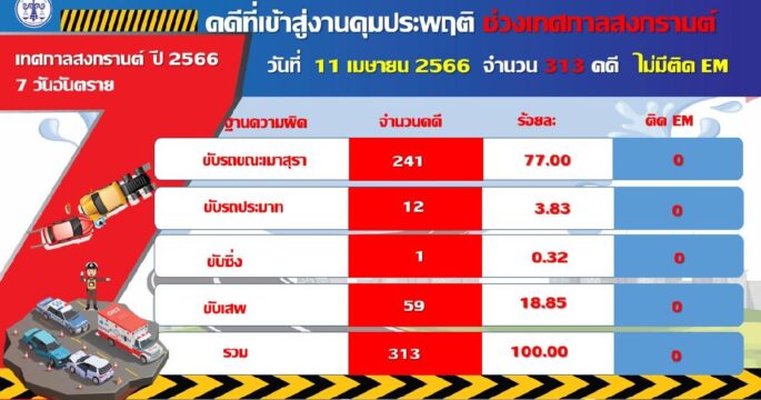 อธิบดีกรมคุมประพฤติเผยประเดิมรณรงค์อุบัติเหตุเทศกาลสงกรานต์วันแรก 313 คดี เมาขับมากสุด 241 คดี กรุงเทพฯ สูงสุด 37 คดี
