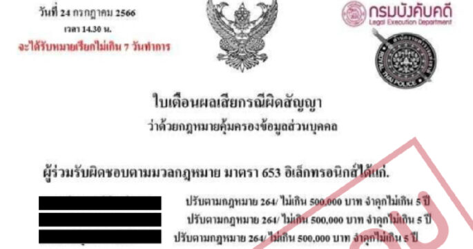 เตือนภัยมิจฉาชีพแอบอ้างโลโก้กรมบังคับคดี แจ้งผิดสัญญาไม่ชำระหนี้
