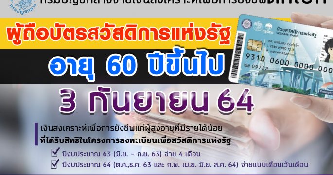กรุงเทพฯ 1 ก.ย.- 3 ก.ย. 64 กรมบัญชีกลางจ่ายเงินสงเคราะห์เพื่อการยังชีพ ตกเบิก ผู้สูงอายุ 60 ปีขึ้นไป ที่ถือบัตรสวัสดิการแห่งรัฐ
