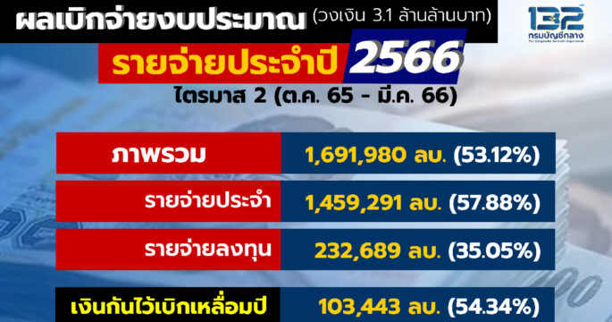 กรมบัญชีกลาง เผยผลการเบิกจ่ายเงินงบประมาณฯ สิ้นไตรมาส 2 ปีงบประมาณ 66 วงเงิน 1.7 ล้านล้านบาท