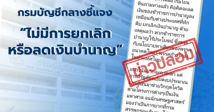 กรมบัญชีกลาง ชี้แจงไม่มีการยกเลิกหรือลดเงินบำนาญ ระบุข้อความที่เผยแพร่ทางสื่อโซเชียล เป็นการแชร์ข้อมูลที่บิดเบือน ก่อให้เกิดความเข้าใจผิดและตื่นตระหนกอย่างมาก
