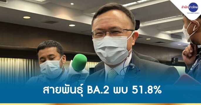 อธิบดีกรมวิทย์แจงสถานการณ์ติดเชื้อโควิดของไทย โอไมครอนยึด 99.6% พบเป็นสายพันธุ์ย่อย BA.2 51.8% เชื่ออีกไม่นานแทนที่ BA.1 เนื่องจากมีอำนาจแพร่มากถึง 1.4 เท่า และพบว่าอัตราการติดเชื้อในครัวเรือน BA.2 พบ 39% BA.1 พบ 29%