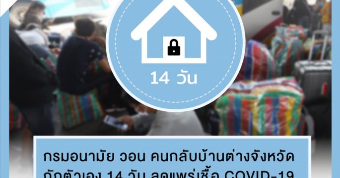 กรมอนามัย ขอให้ประชาชนที่เดินทางกลับบ้านต่างจังหวัดให้ความร่วมมือกับหน่วยงานราชการ กักตัวเองอยู่กับบ้าน 14 วัน เพื่อเฝ้าระวังอาการ -ลดการแพร่เชื้อโควิด-19