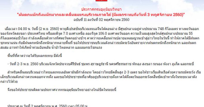 อุตุฯ ออกประกาศเตือนภาคใต้ฝนตกหนักถึงหนักมาก ถึง 3 พ.ย. ระวังน้ำท่วมน้ำป่าหลาก ส่วนภาคเหนือหนาวเย็นลงอีก 1-2 องศาฯ