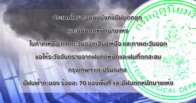 กรมอุตุฯ เผยไทยตอนบนฝนชุก ตกหนักบางแห่งในภาคเหนือ ภาคตะวันออกเฉียงเหนือ และภาคตะวันออก ส่วนกรุงเทพฯ ปริมณฑล ฝนฟ้าคะนอง 70% ของพื้นที่