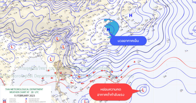 อธิบดีกรมอุตุนิยมวิทยาระบุ วันที่ 14-15 ก.พ. ประเทศไทยตอนบนมีอากาศแปรปรวนเนื่องจากมวลอากาศเย็นแผ่ลงมาปกคลุม แล้วปะทะกับหย่อมความกดอากาศต่ำที่ปกคลุมอยู่ก่อน ส่งผลให้มีฝนฟ้าคะนอง โดยมวลอากาศเย็นจะแผ่ลงมาถึงภาคตะวันออกเฉียงเหนือเป็นพื้นที่แรกจะทำให้เย็นพรุ่งนี้จะได้สัมผัสอากาศเย็นก่อนพื้นที่ จากนั้นลมหนาวจะมีกำลังแรงขึ้น ทำให้อากาศประเทศไทยตอนบนกลับมาเย็นอีกครั้ง