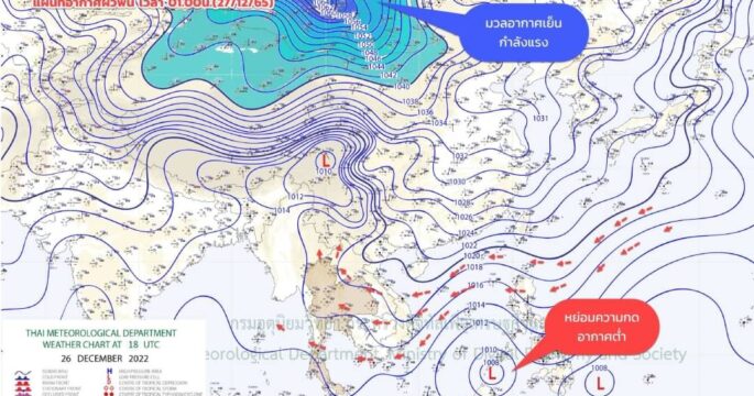 กรมอุตุฯ เผยไทยตอนบน อากาศหนาวเย็น อุณหภูมิลด 1-2 องศาฯ เตือนอ่าวไทยตอนล่าง คลื่นสูง 2-3 เมตร เรือเล็กควรงดออกจากฝั่งช่วง 25-26 ธ.ค.นี้