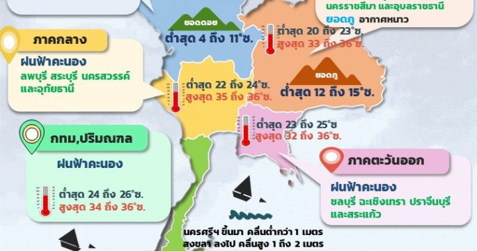 กรมอุตุฯ เผยภาคตะวันออกเฉียงเหนือตอนล่าง และภาคตะวันออก มีฝนฟ้าคะนองกับมีลมกระโชกแรง ในขณะที่มีอากาศเย็นถึงหนาวในภาคเหนือและภาคตะวันออกเฉียงเหนือ อุณหภูมิลดลง 2-4 องศาฯ ยอดดอยและยอดภูมีอากาศหนาวถึงหนาวจัด อุณหภูมิต่ำสุด 1-13 องศาฯ